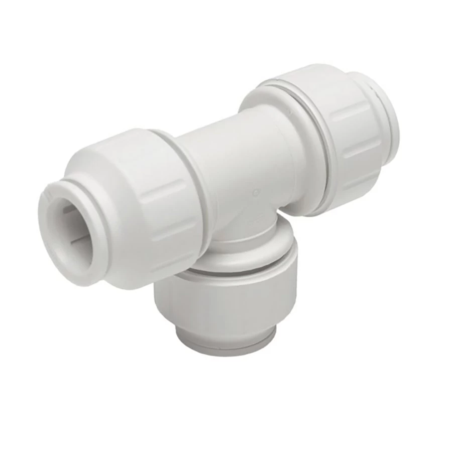 John Guest 1″ CTS union tee is produced in white polypropylene, the collet is produced in polypropylene with stainless steel teeth, and the ‘O’Rings are EPDM.