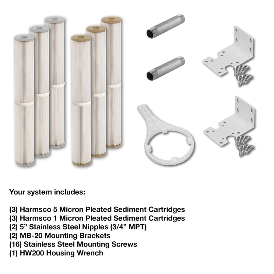 - (3) Harmsco Industrial Quality WB-20-5W Pleated 5 Micron 20″ Sediment Prefilter